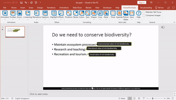 To learn how to use eLL, let us walk through a scenario of adding explanations to a slide. Suppose you have a slide like this (see screenshot below) that has a list of bullet points that appear one after the other and you want to add explanations to each bullet point.