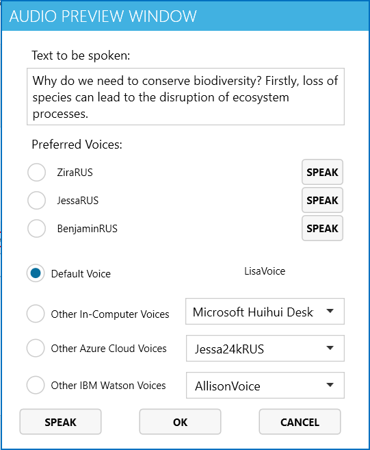 button next to it. To preview other voices, select the voice (using the radio button and drop-downs) and click on speak