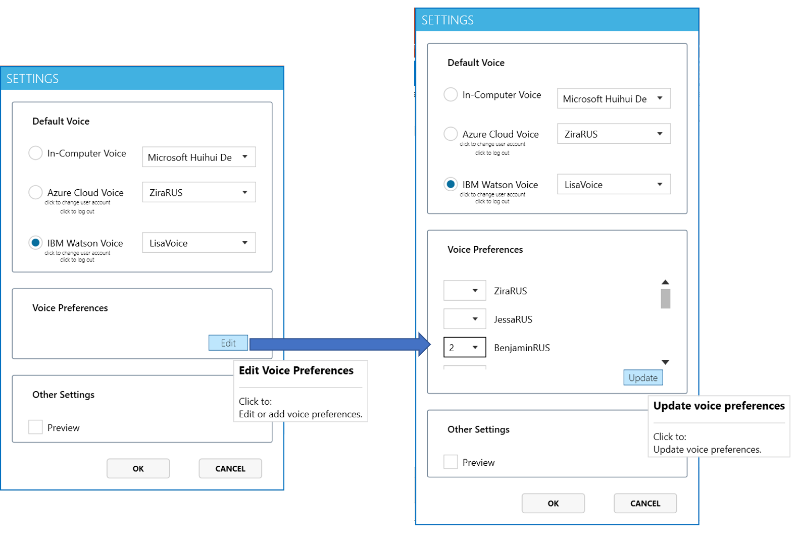 You can also select and rank up to 5 preferred voices (reason: preferred voices are easier to preview when trying to select a voice for an explanation). To set preferred voices, click on the Edit