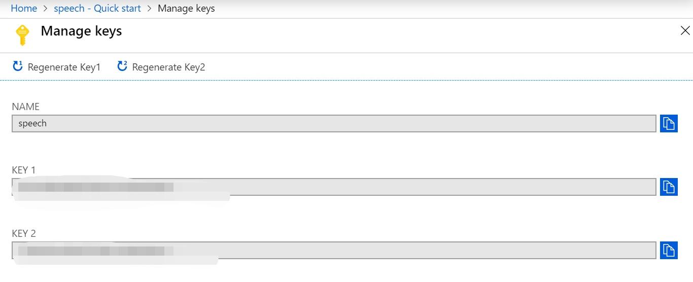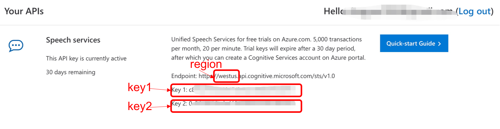 Copy key 1 or key 2. Use this API key to login to Azure account and select the correct region during login.