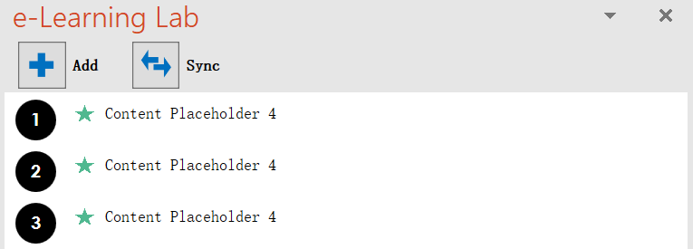 The items you see in the eLL task pane are animations that already exists in the slide (i.e., those used to animate the three bullet points). The number on each item corresponds to the click number under which the animation should appear e.g., the first bullet point appears after the first click.
