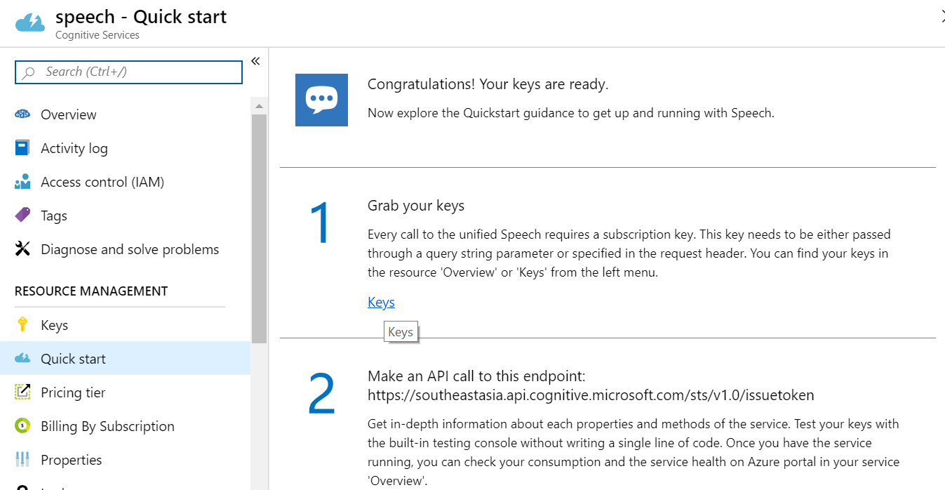 link and copy any of the keys below. Use the API key and instance region to login to Azure Cloud Services from e-Learning Lab.
