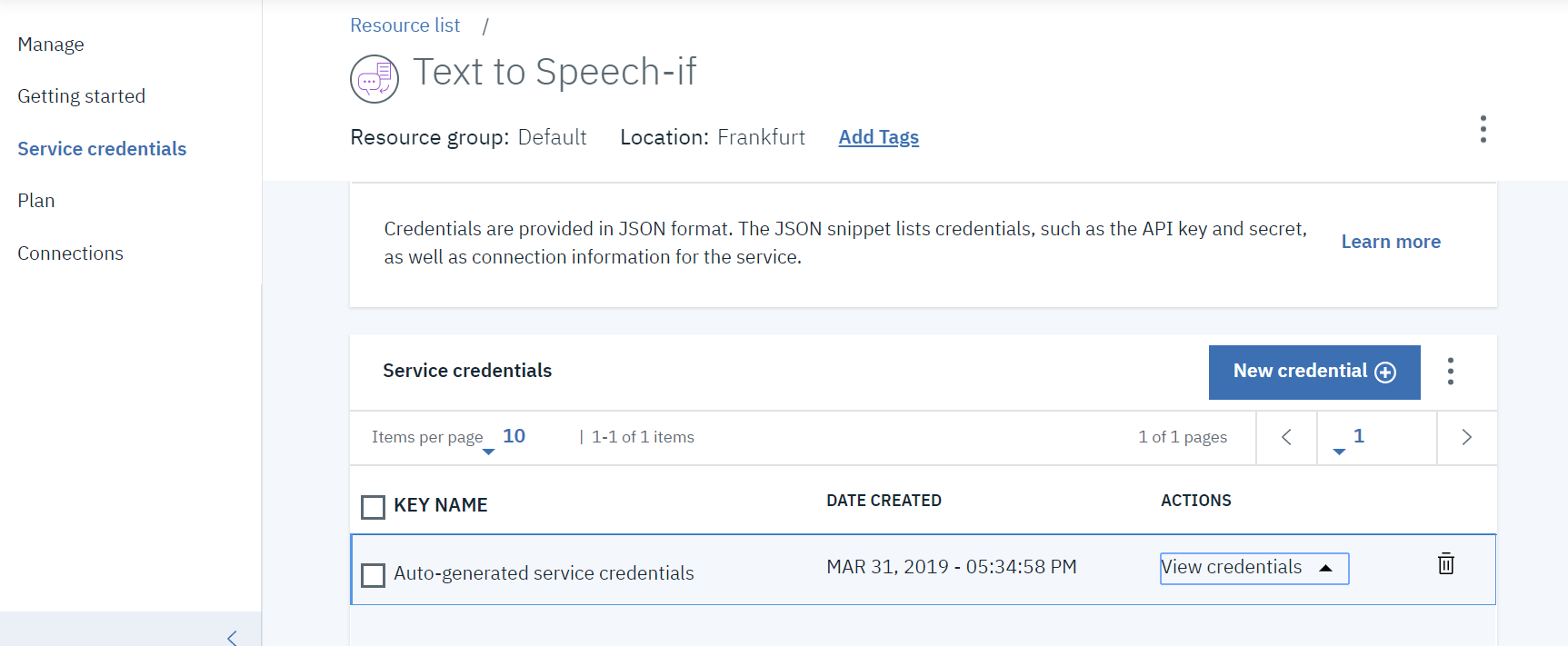 You will be auto-directed to the newly created text-to-speech instance. Click on Service credentials