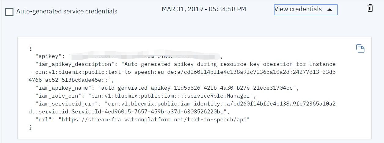 Copy the apiKey value. Key in this value when you login to Watson voice. The region refers to the location where you choose your instance to be deployed in.