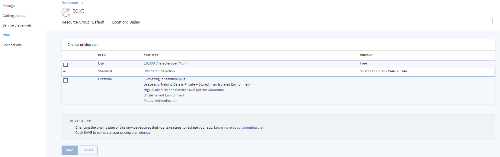 If you create your TTS instance under free tier, then you are only allowed to generate 10,000 characters per month. The instance will be automatically deleted after 30 days of inactivity. To upgrade to standard tier, go to your dashboard and click on your instances. Choose Plan