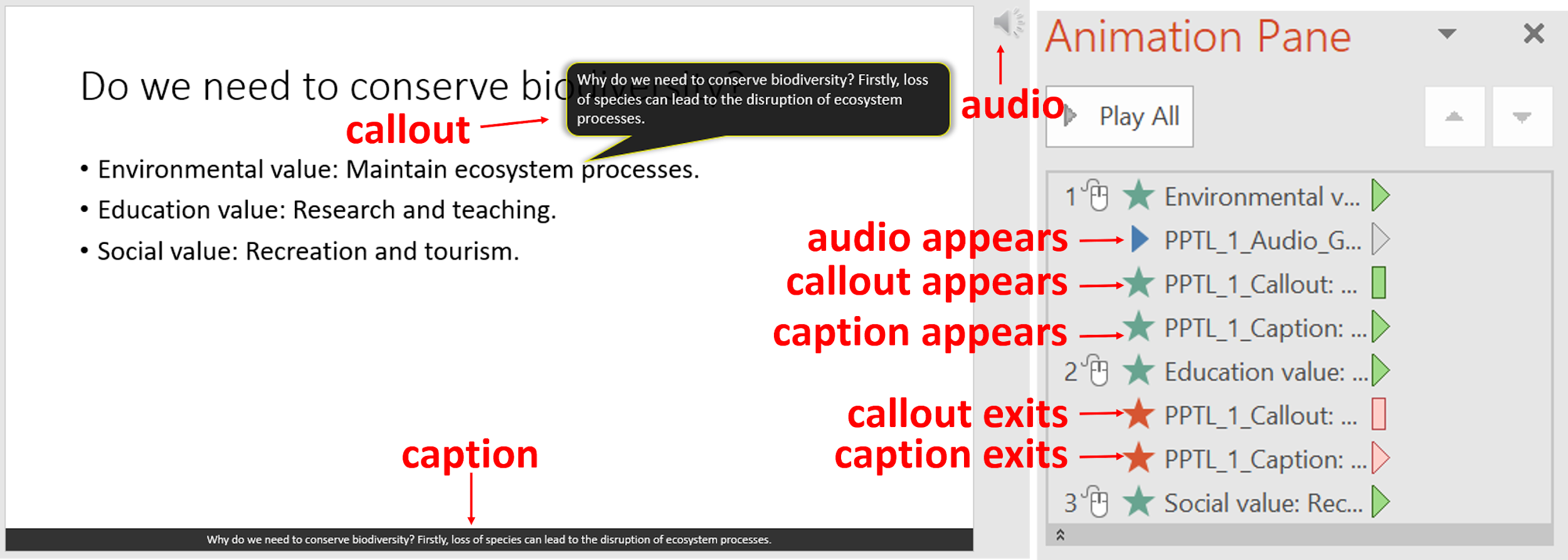 You will notice that a callout, a caption and an audio has been added to the slide and corresponding animations have been created on PowerPoint’s Animation Pane