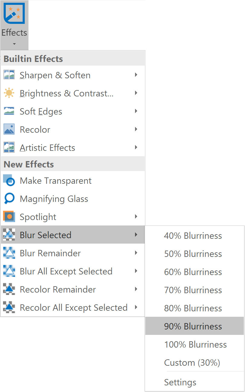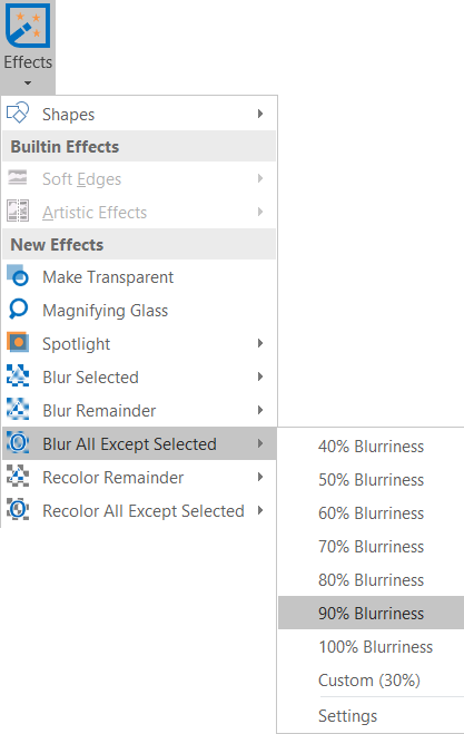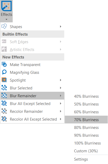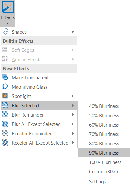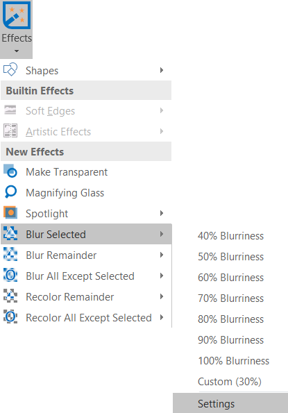 , the custom blurriness you specified will be on the Effects dropdown menu with the text "Custom (30%)". Where "30%" is the custom blurriness you specified.