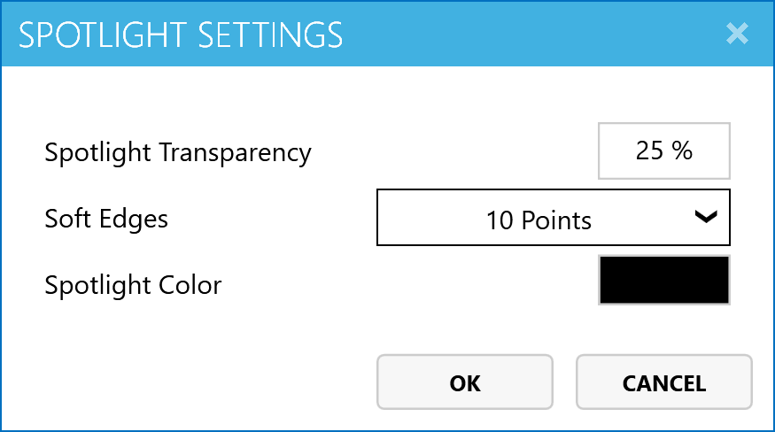 If you'd like, you can adjust the transparency of the darkened area and the softness of the spotlight's edges from the same tab. Just click the options button here: