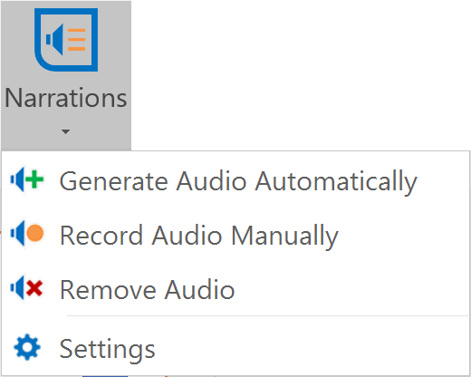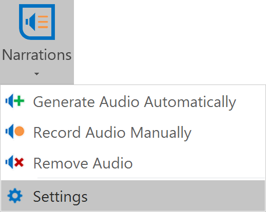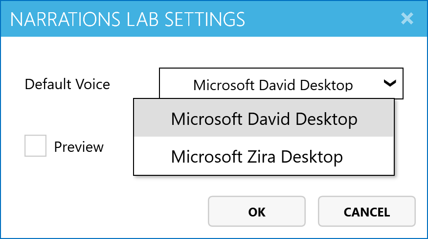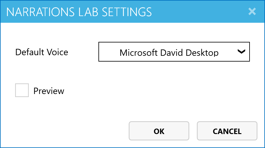 The settings dialog allows you to change the default voice used for narration, or to preview audio after it is added: