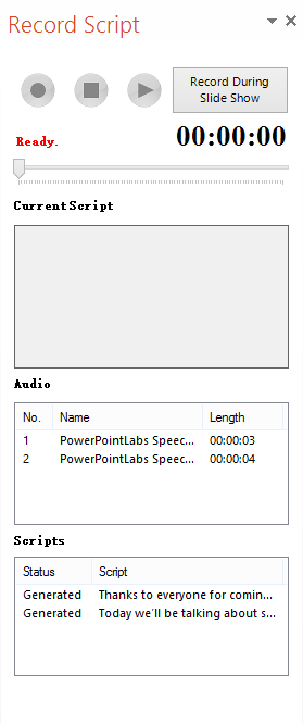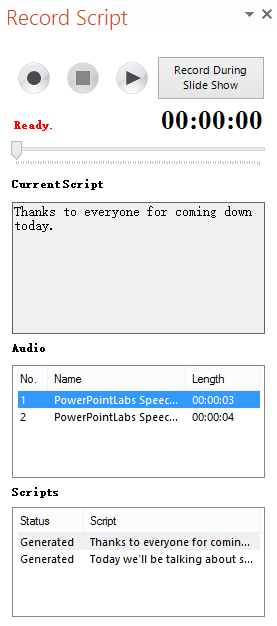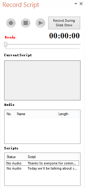 panel of the recording pane. To replace a particular section of the narration, simply select it - the corresponding section of the script (from the speaker notes) will then be shown in the Current Script