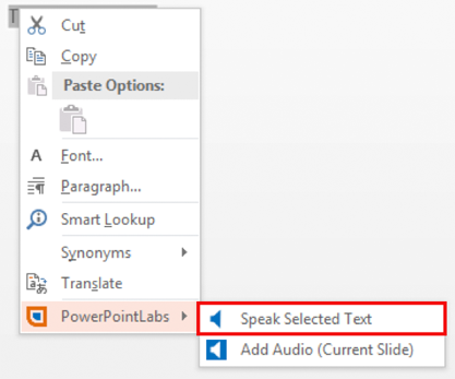 To hear what a particular sentence or phrase will sound like without having to add audio for the entire slide, simply select it in the Speaker Notes pane, right-click, and choose Speak Selected Text