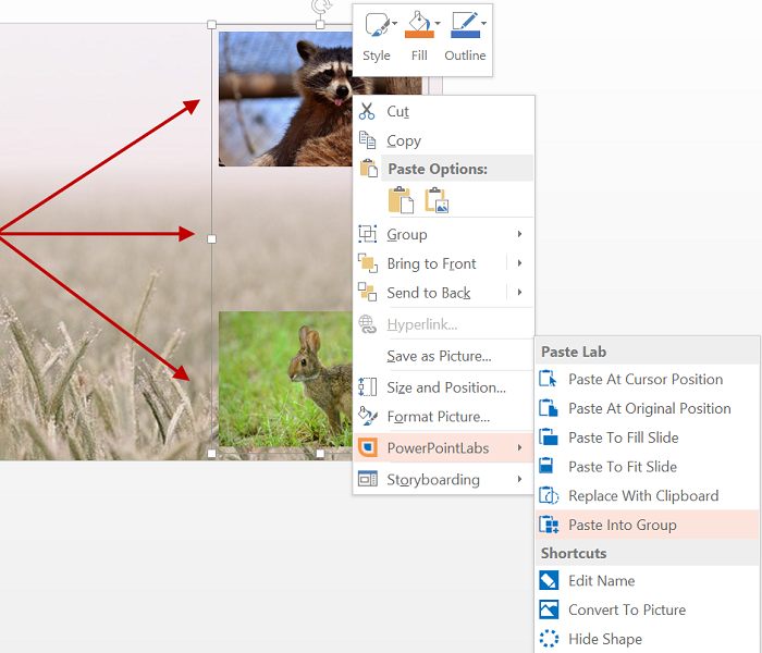 Multiple objects can be selected to be used for Paste To Fill Slide, and the pasted objects will automatically be grouped together.