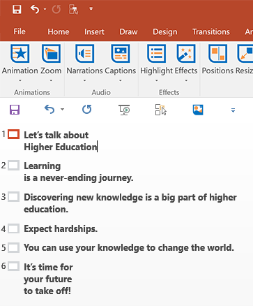 Let’s go through the typical steps of using PSL to create a Picture Slide deck from scratch. First, we can specify what text to include in each slide. The easiest way to specify that is to type it in the outline view