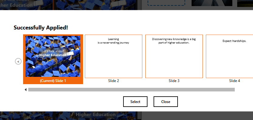 In the confirmation dialog (an example shown above), click the slide you want to design next and click Select