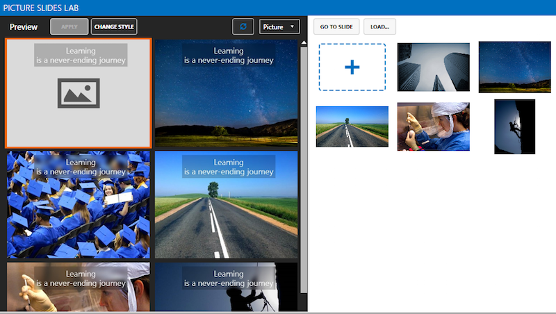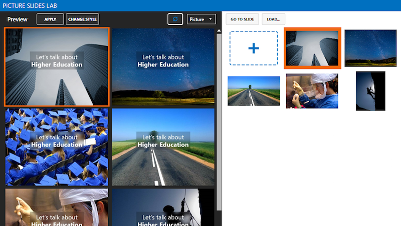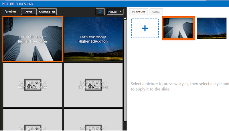 PSL will show a preview of that slide with different pictures in your picture collection, using the style you used (including all the tweaks you did) for the slide you designed immediately before .