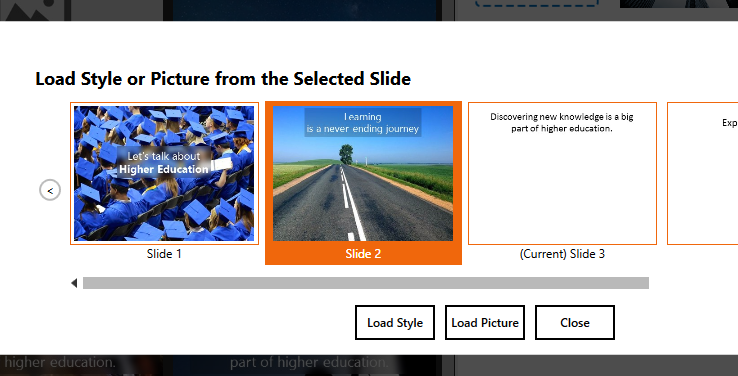 button to load the picture or the style. PSL will show a preview of the current slide with the loaded picture. You can tweak the design further if necessary, before applying it to the current slide.