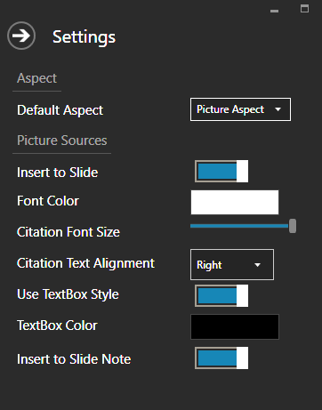 If you would like PSL to insert the picture source to the bottom of the slide itself, go the the Settings