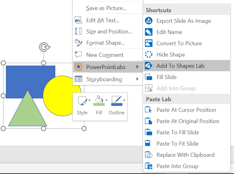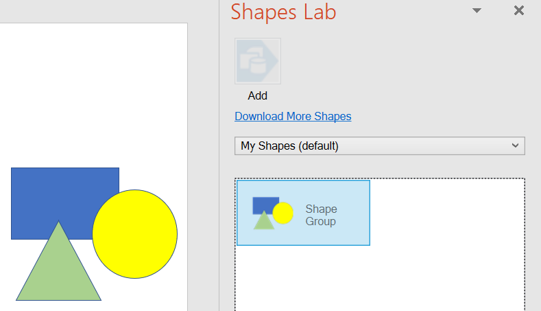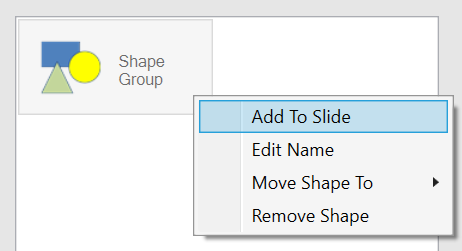 Once a shape has been saved in the Shapes Lab, it can be reused anywhere in the presentation (or even in other presentations). To add a shape to the current slide, either double-click on the entry in the Shapes Lab, or right-click and select Add to Slide