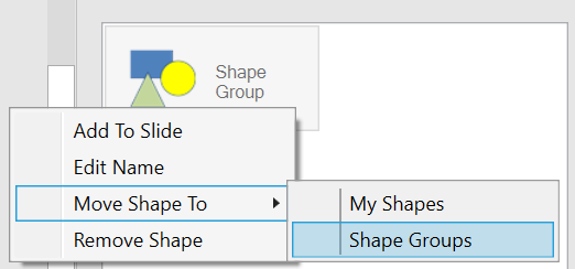 Once you have more than one category in the Shapes Lab, you can use the Category drop-down menu to switch between them. Shapes can be moved between categories by right-clicking on the shape and choosing the destination category from the context menu.