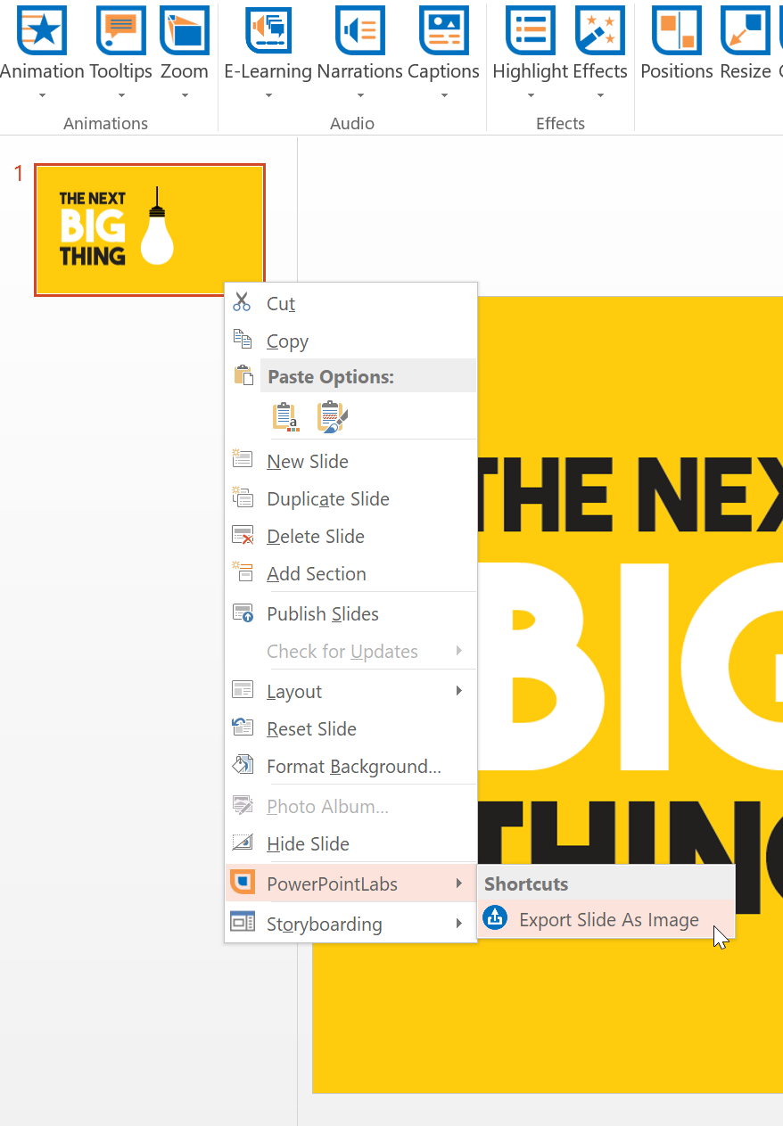 Right-click on a slide thumbnail and choose this option in the submenu PowerPointLabs