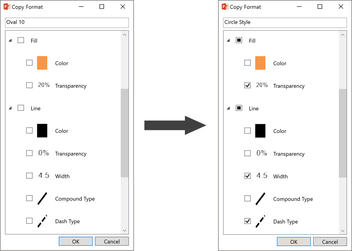 Sync Lab allows you to ‘sync’ (i.e. copy-paste) only selected properties from one PowerPoint object to another, for example, to sync the text formatting from one object to another. This comes handy when you want to apply a combination properties consistently across multiple objects (even in multiple slides) without affecting other properties of those objects.