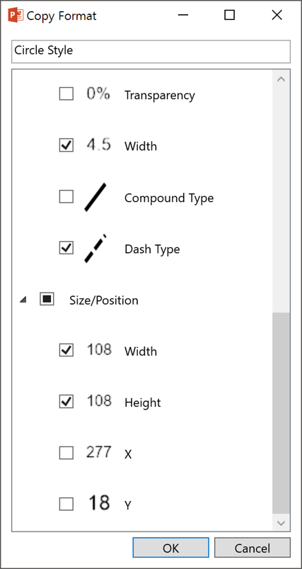 Note: When editing a copied format, the properties shown in the pop-up window are the properties of the object the style was originally copied from, as at the point of copying. You can select these properties even when the original object is deleted from the slide.
