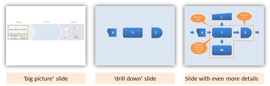 To create the effect of zooming back out to the "big picture" slide, simply duplicate the "big picture" slide and place it after the "drill down" slide. Next, select the picture of the "drill down" slide and click Step Back