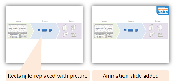 PowerPointLabs will replace the rectangle with an image of the "drill down" slide, and add an animation slide with the zoom effect.